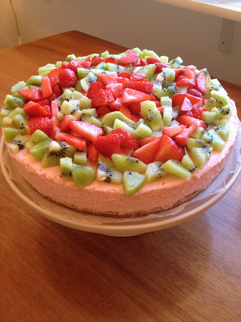 Tässäpä on hyvä vaihtoehto perinteiselle kesäiselle mansikkakakulle, jos ei ole esimerkiksi kermavaahdon ystävä. Tämä kesäpäivän piristys on mansikkamousse -juustokakku, joka on koristeltu tuorein mansikoin ja kiiwein.